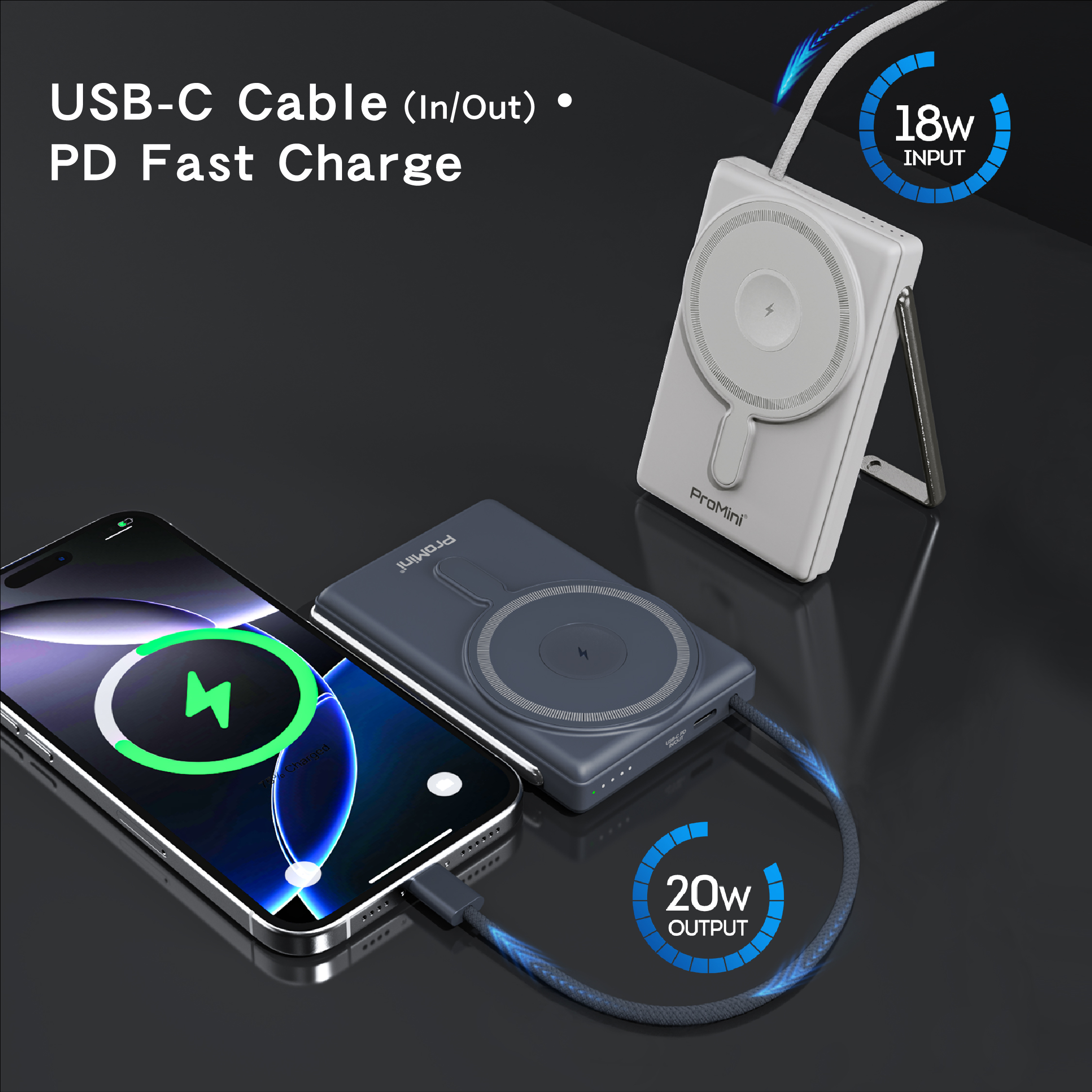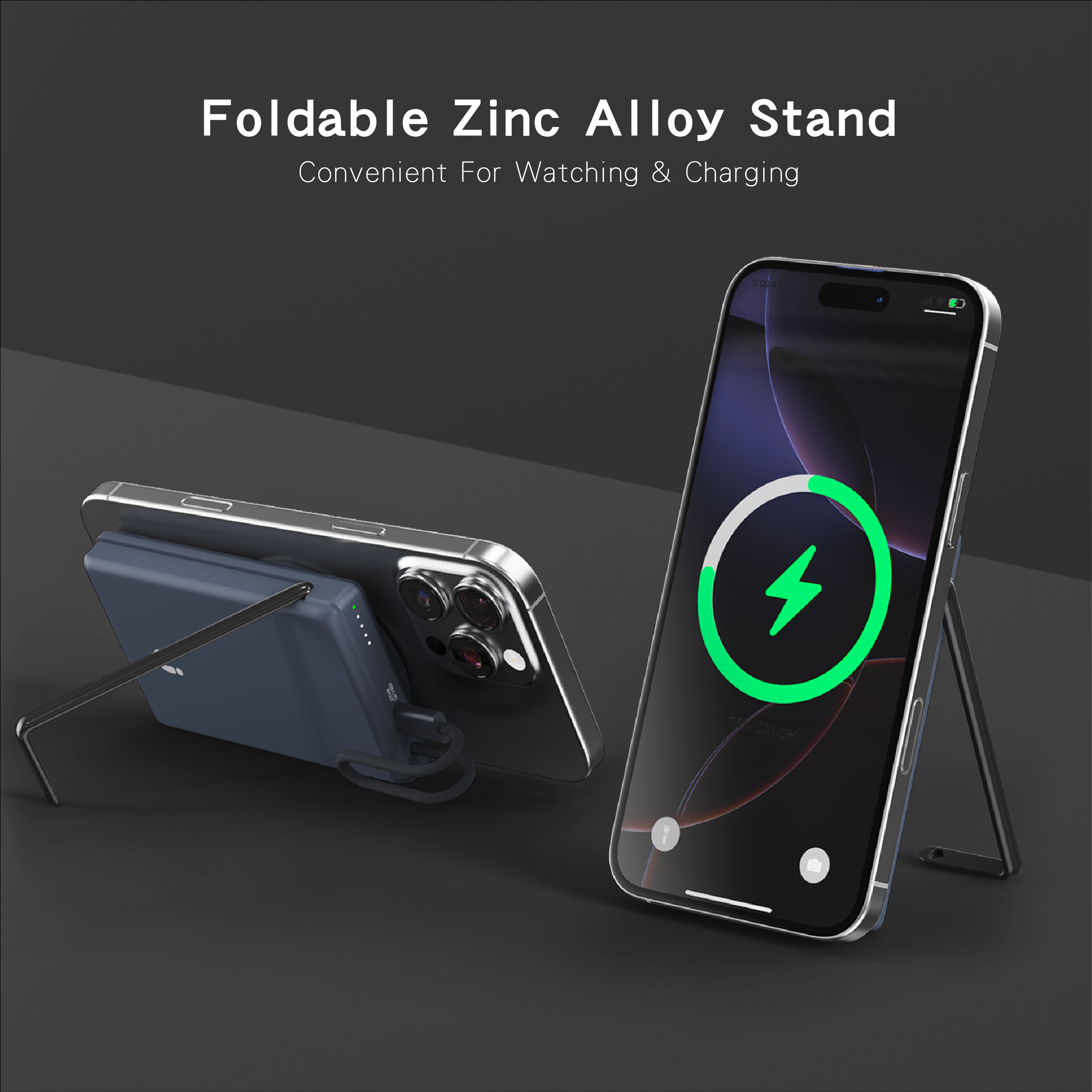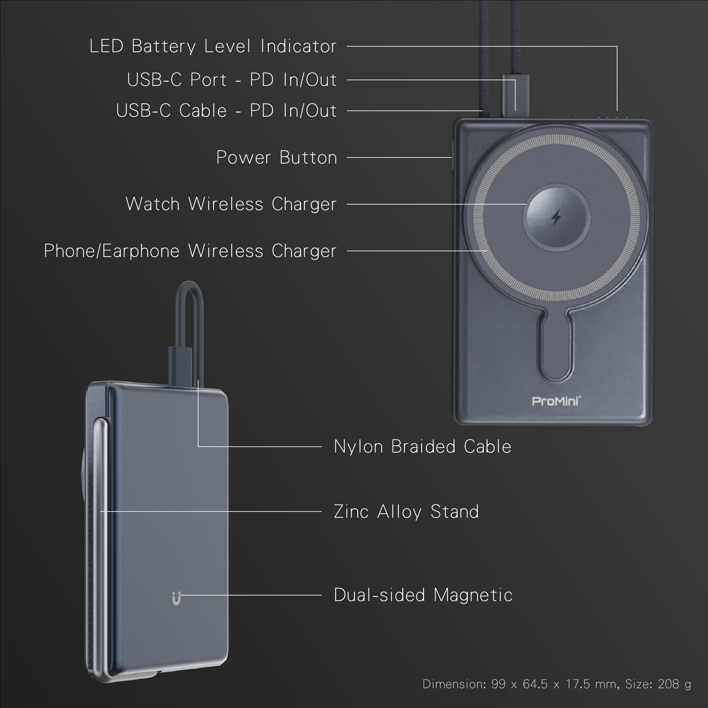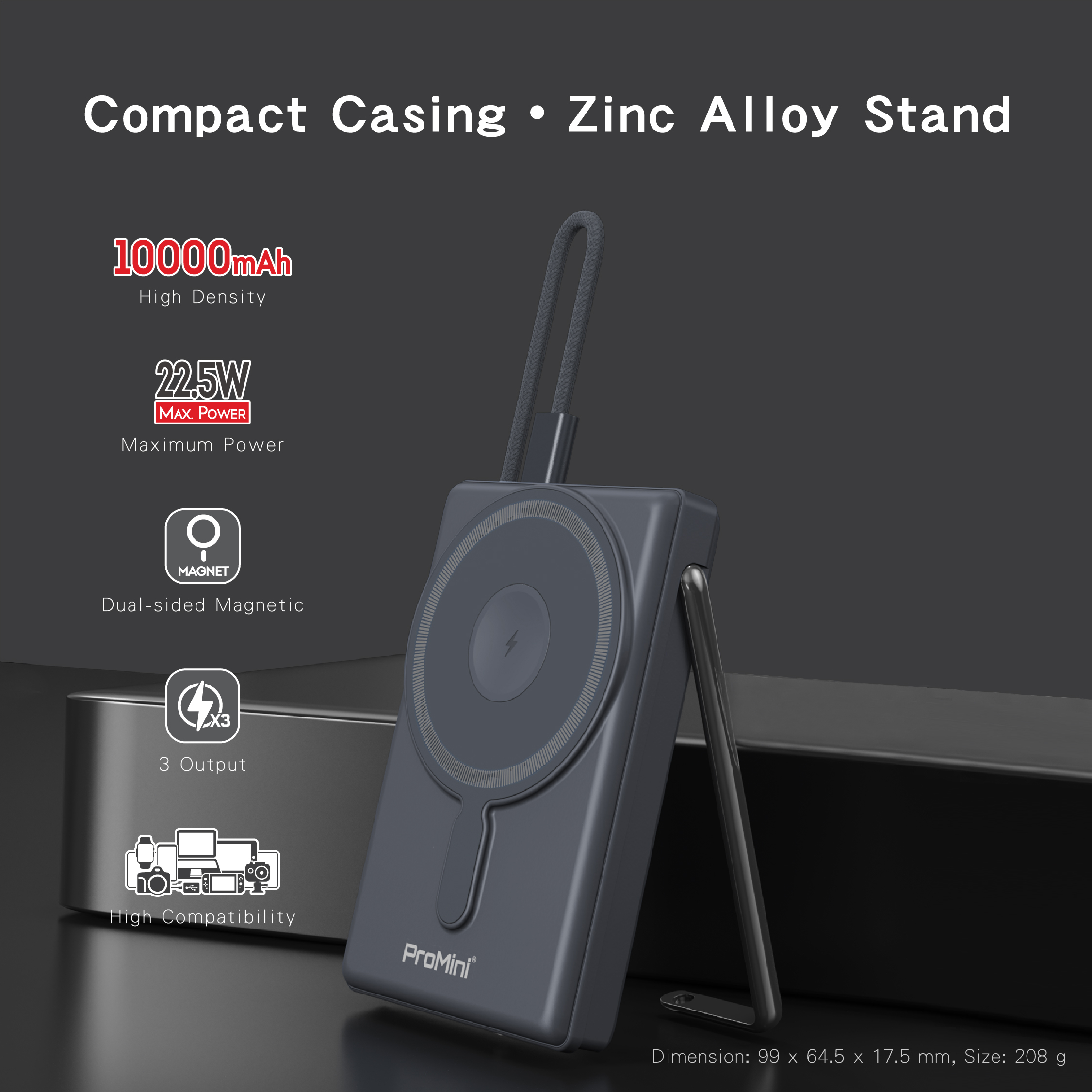 Equipped with 10000mAh high density Lithium-Polymer battery.- Compact casing, built-in USB-C cable(in/out) with Zinc alloy stand.