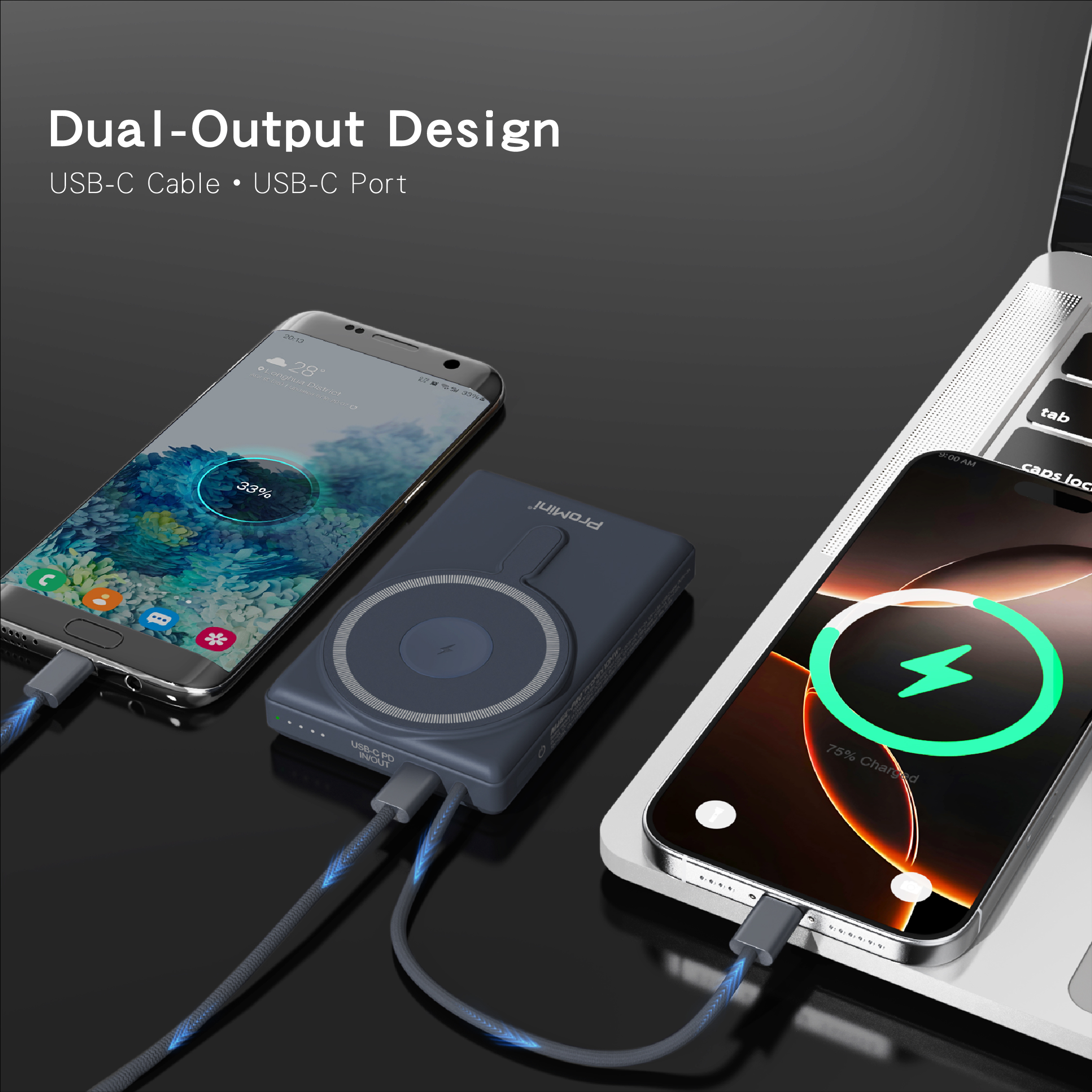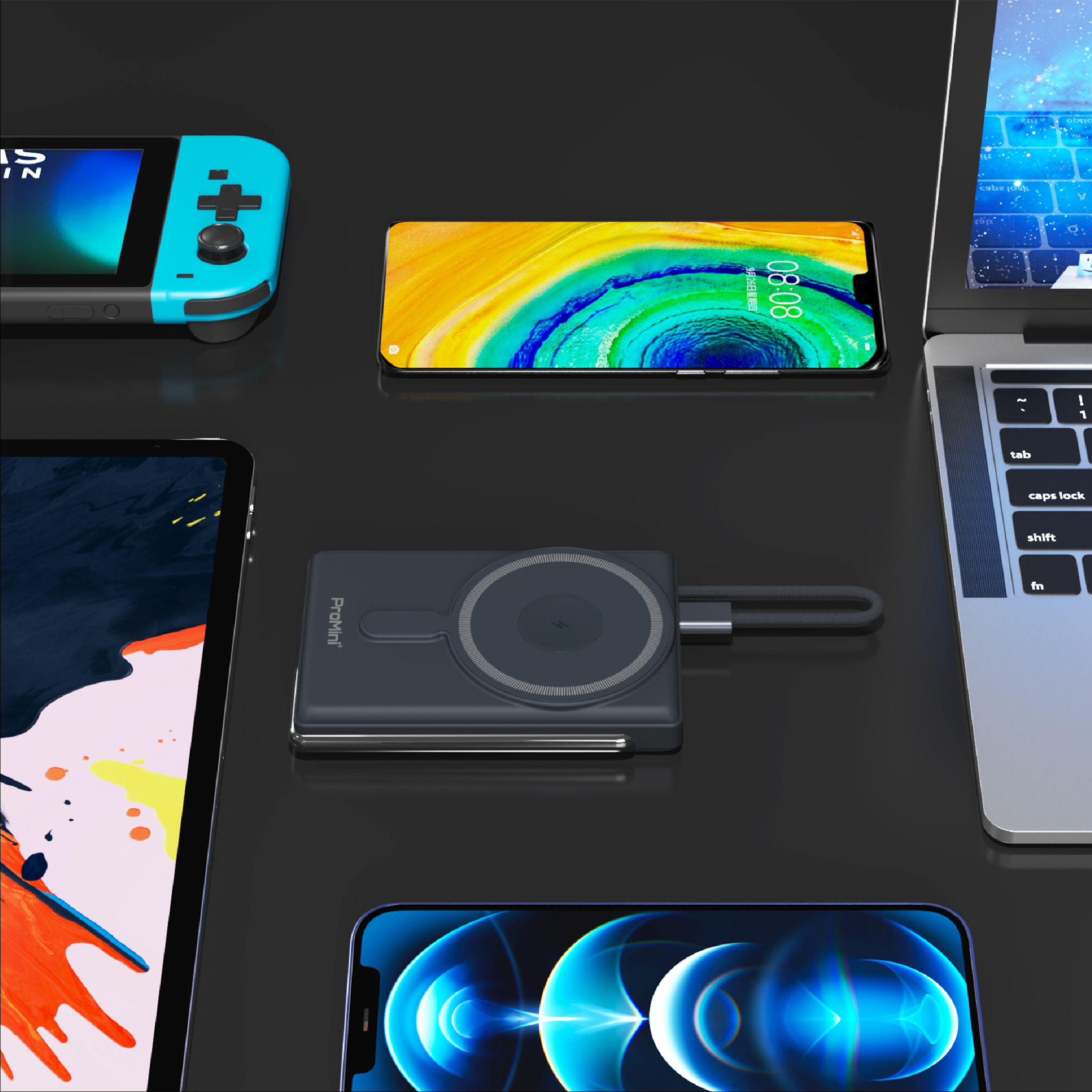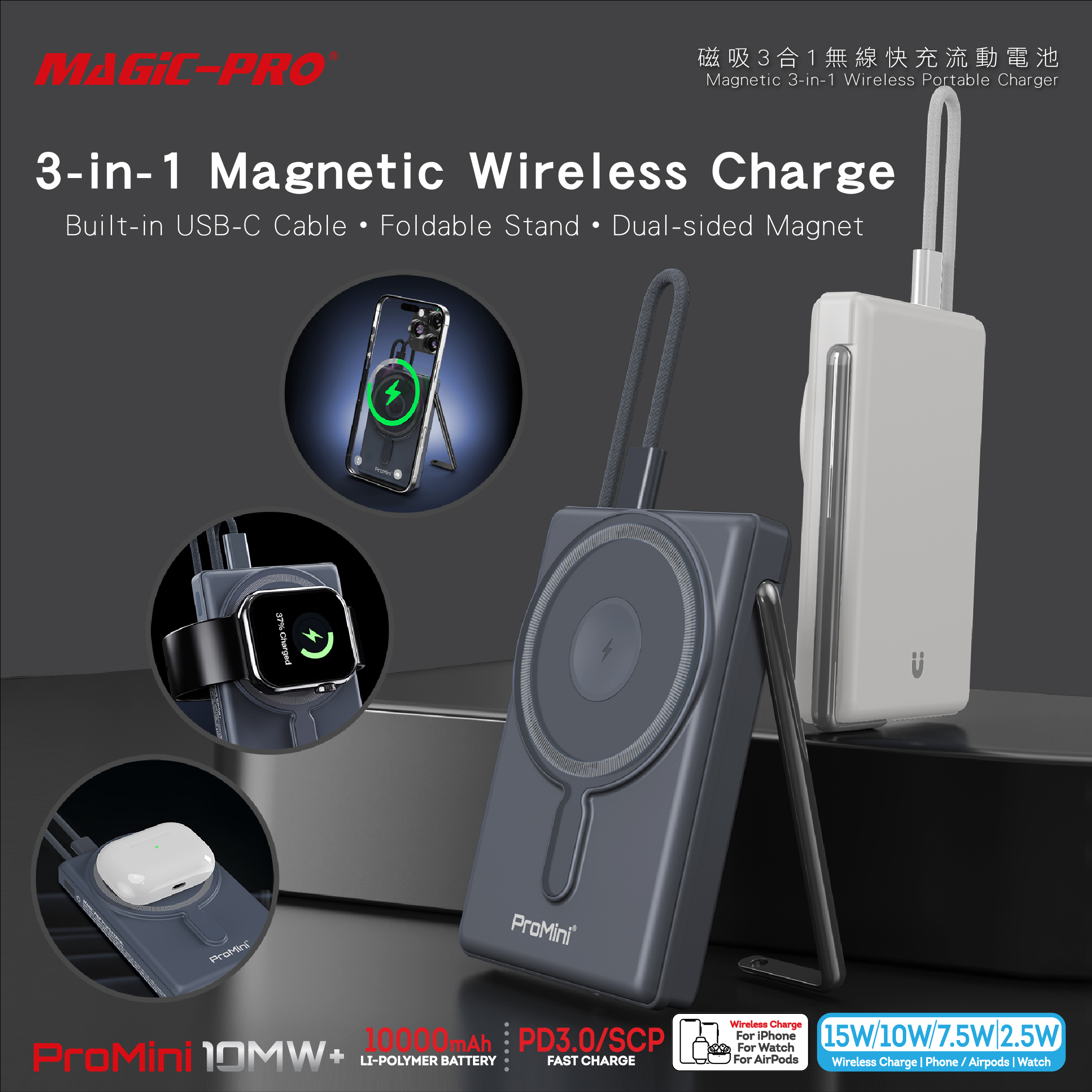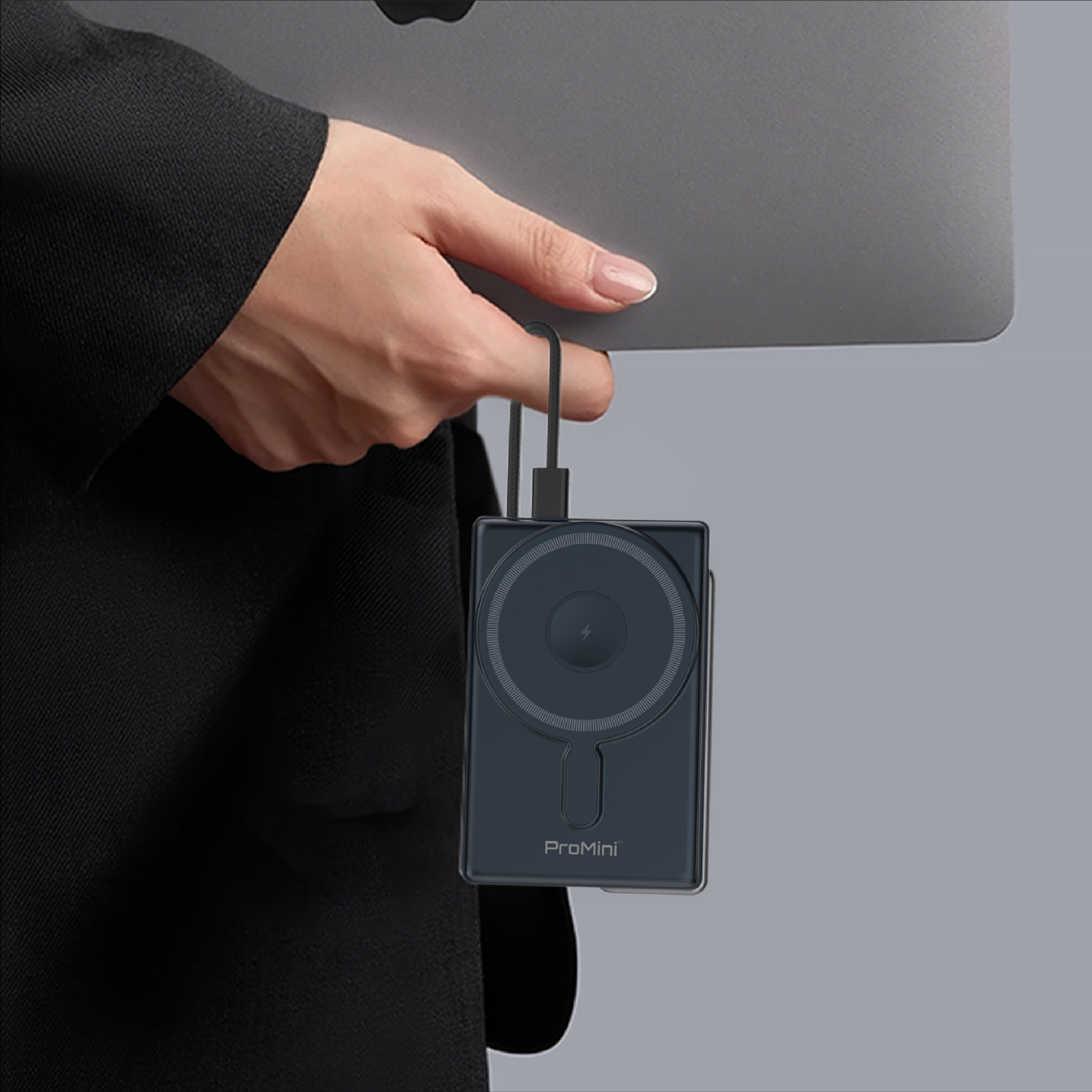 Equipped with 10000mAh high density Lithium-Polymer battery.- Compact casing, built-in USB-C cable(in/out) with Zinc alloy stand.
