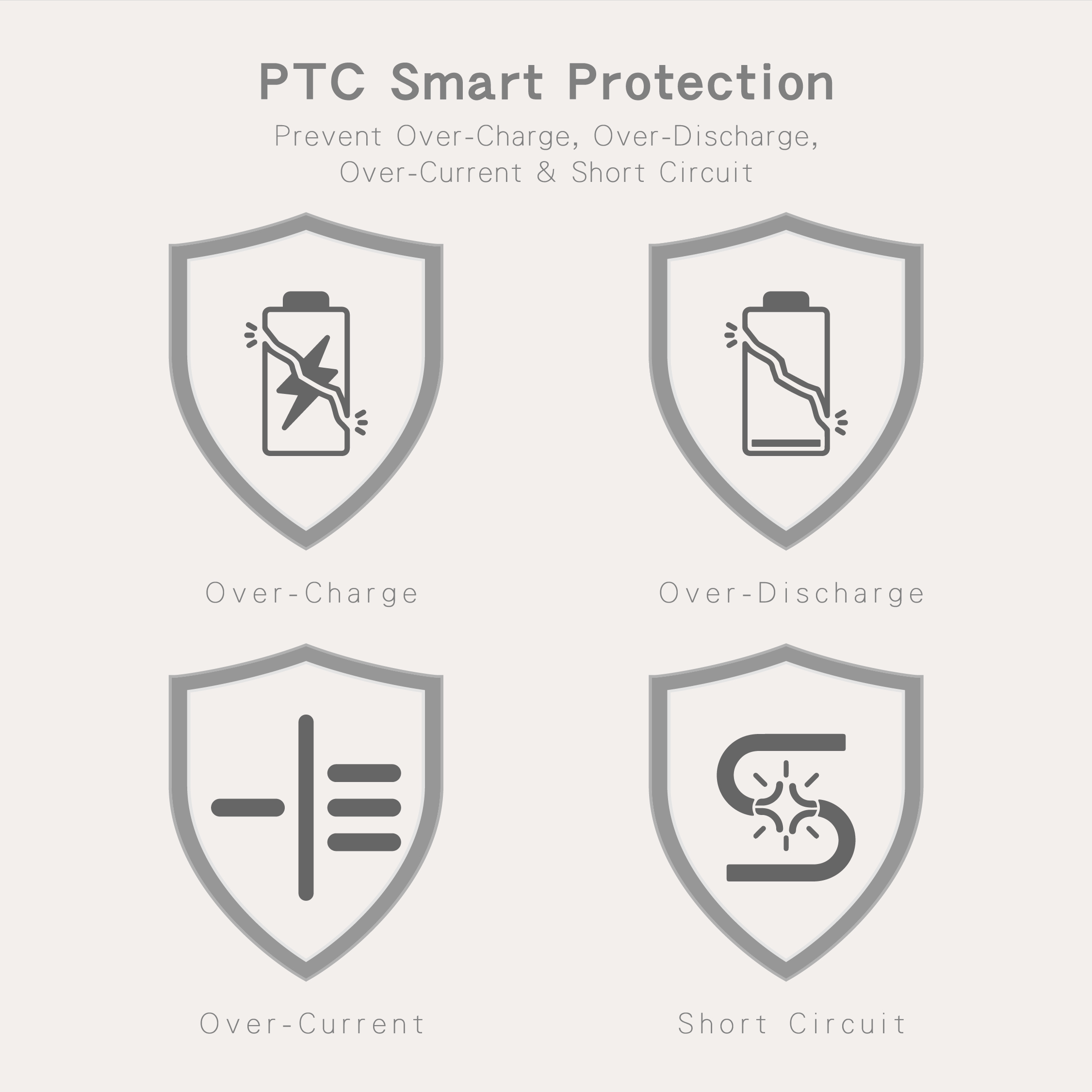 PTC smart protection, prevent Over-Charge, Over-Discharge, Over-Current and Short Circuit.