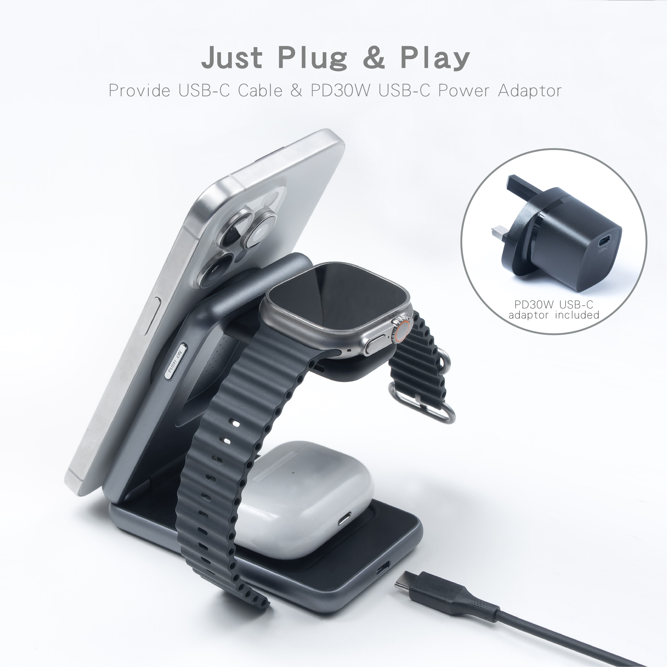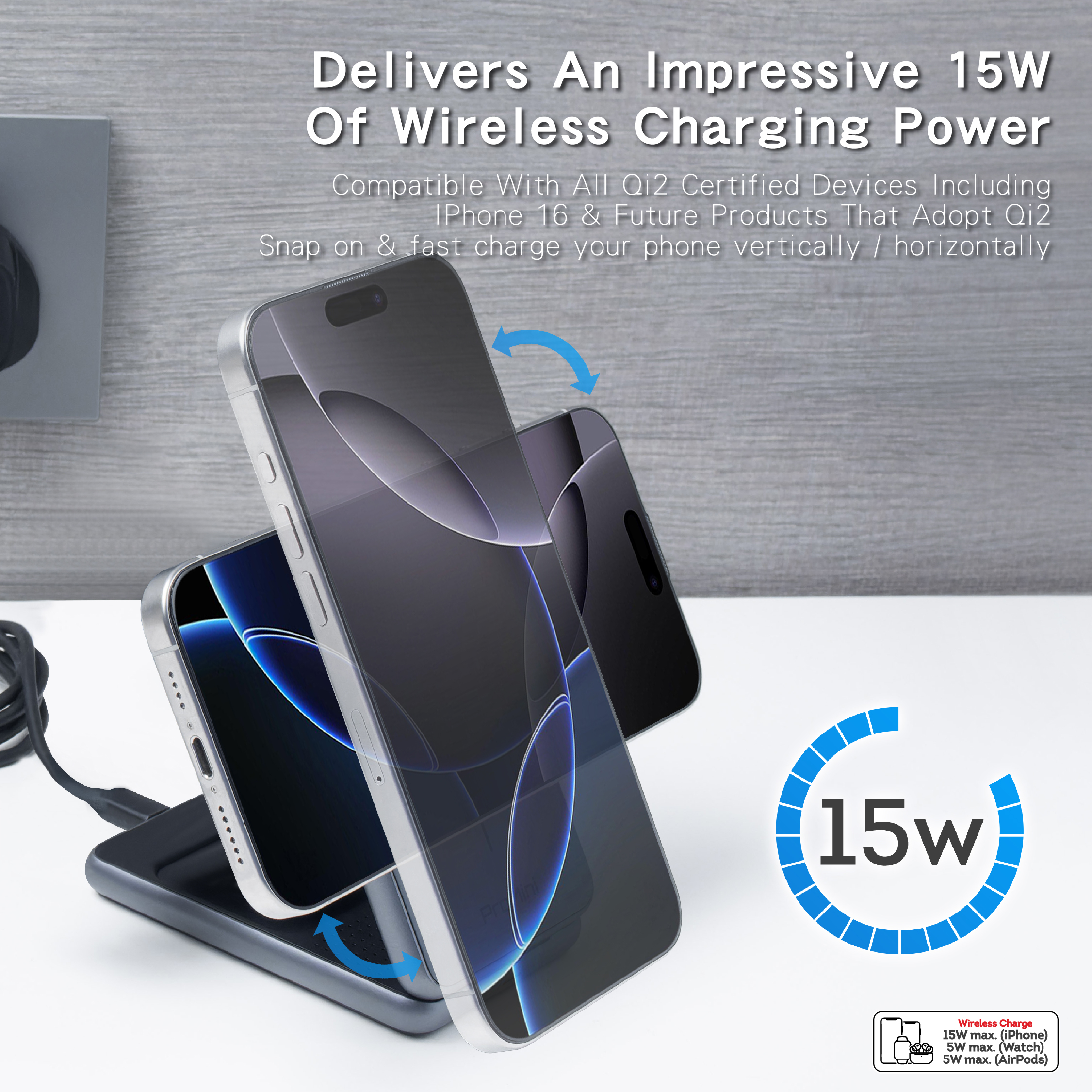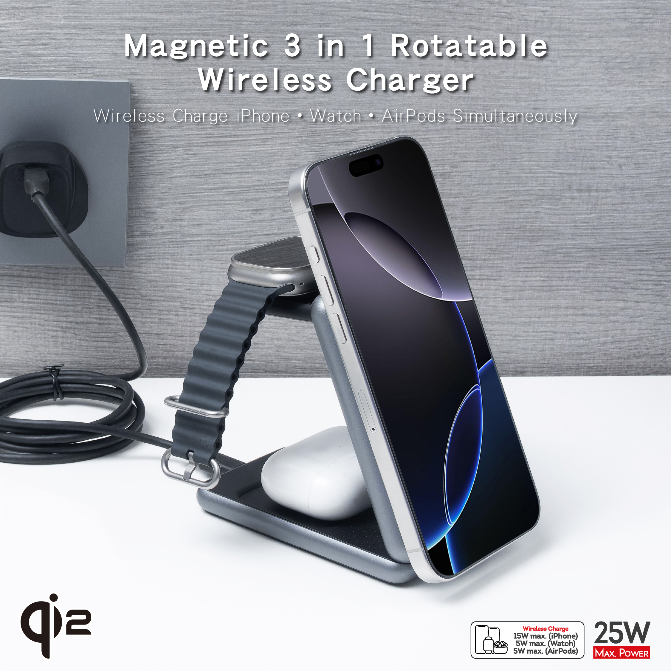 - 25W Qi2-certified Magnetic 3 in 1 Foldable Wireless Charger with power adaptor.