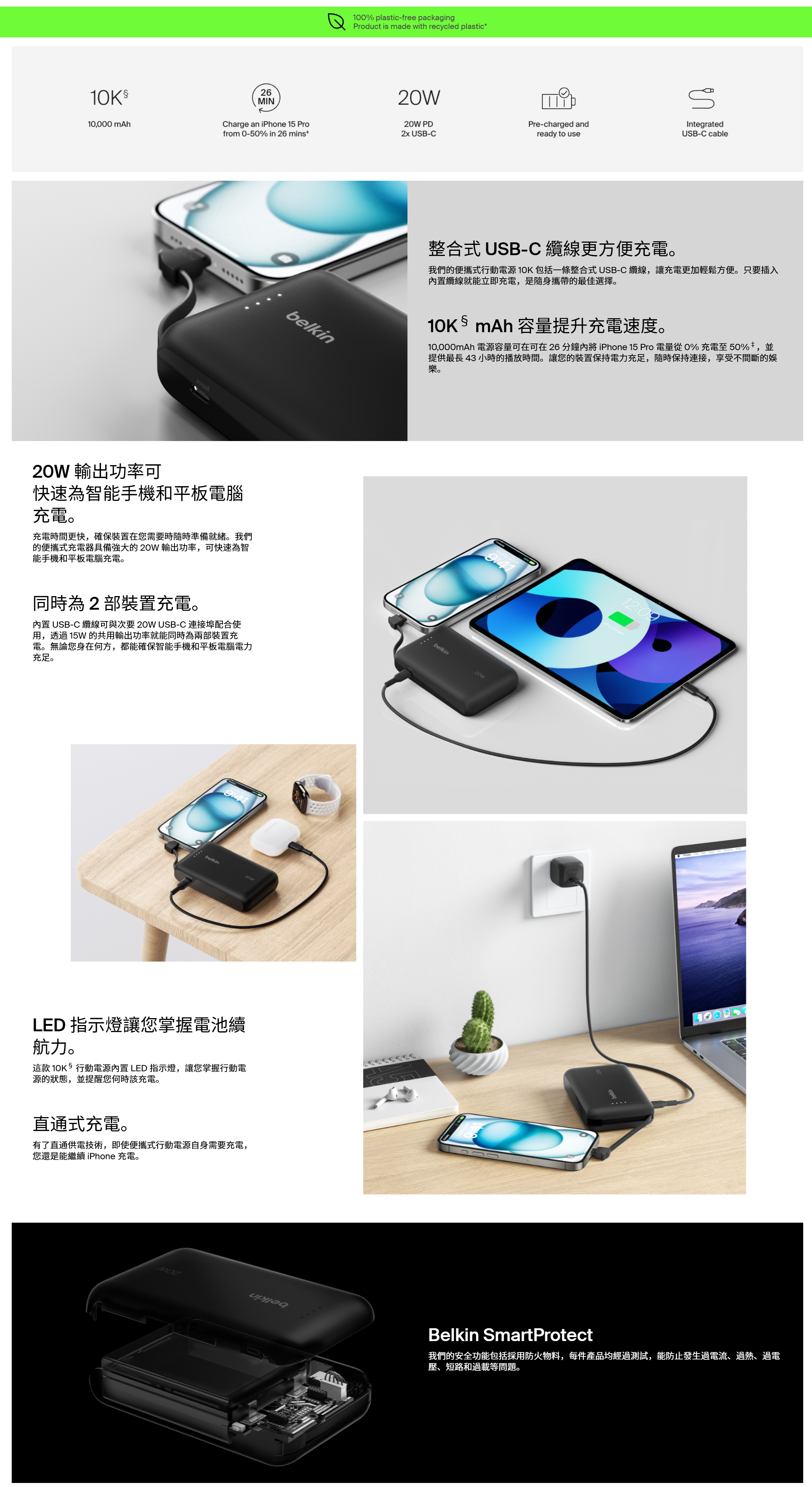 使用我們輕便的10K行動電源,充電功率可達20W。其整合的USB-C®️線設計,提供便捷的快速充電體驗,無需攜帶額外的線材。USB-C端口允許同時為第二個設備充電。