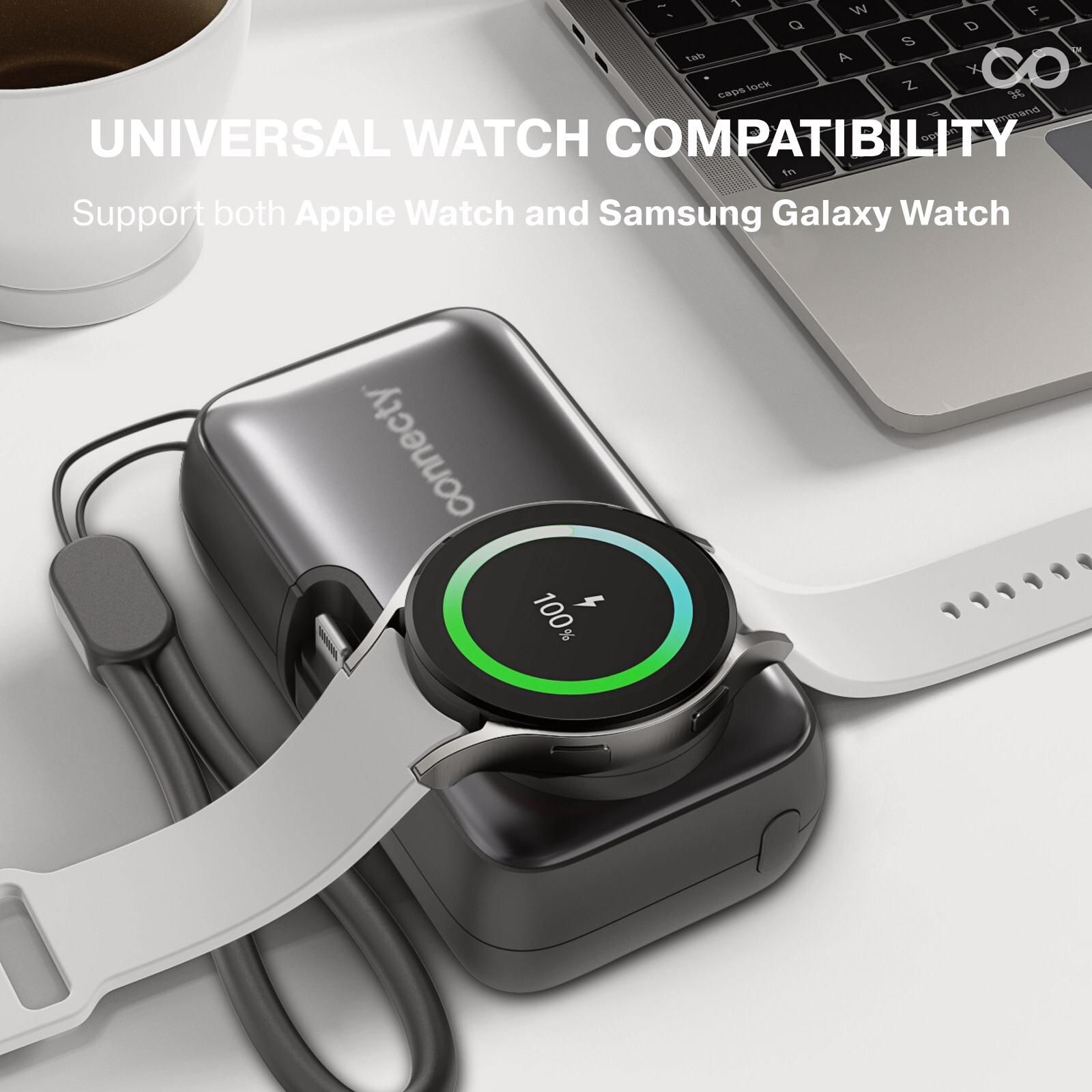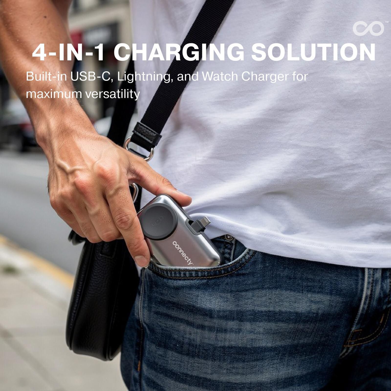 同時支援 Type-C、Lightning 及 Apple / Galaxy Watch 充電,真正一機4用// 搭載PD20W快充技術充電速度更快,適合應付多裝置高效需求// 體積小巧,方便攜帶、隨身放入褲袋或手袋// 內置支架設計,充電同時作手機支架,隨時追劇或工作// 通過 CCC 安全認證,用得更安心//