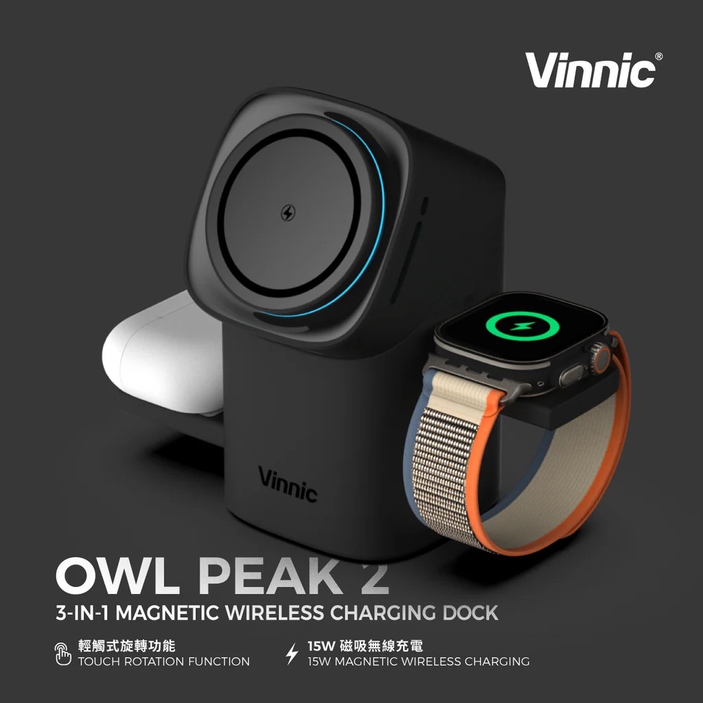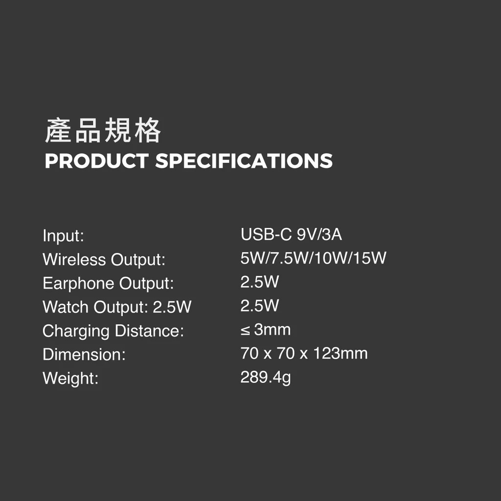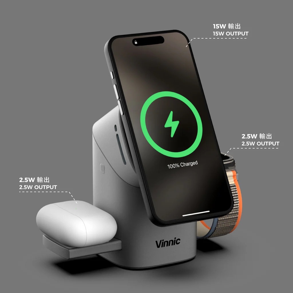 創新觸控自動旋轉及彈出功能,同時為手機、耳機和手錶充電。內置散熱風扇和可調氣氛燈,提供15W快速充電,是您桌面的完美充電解決方案。